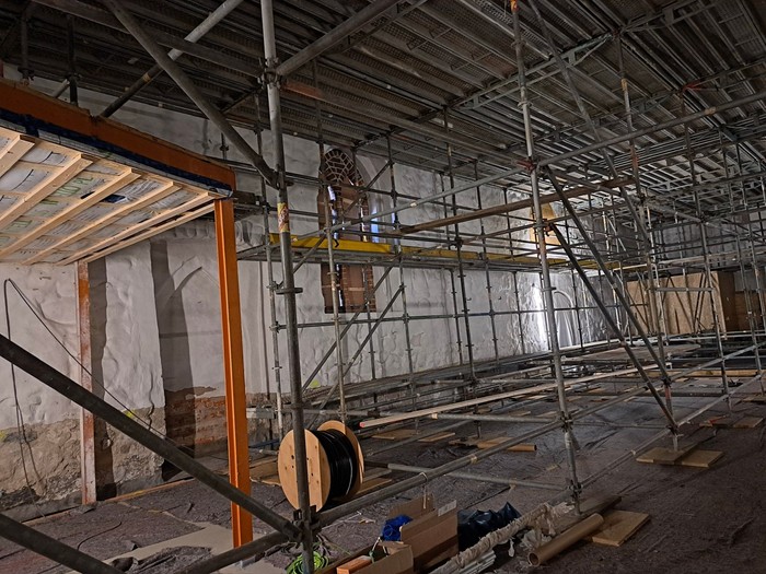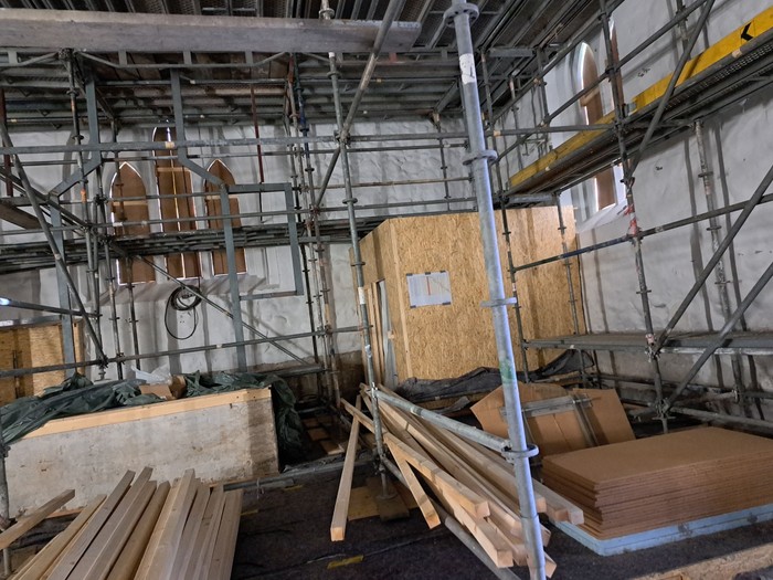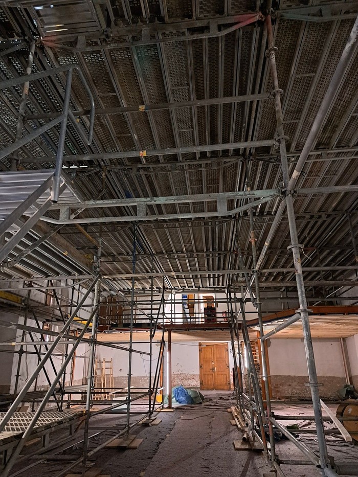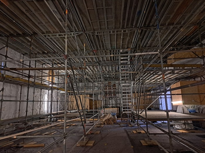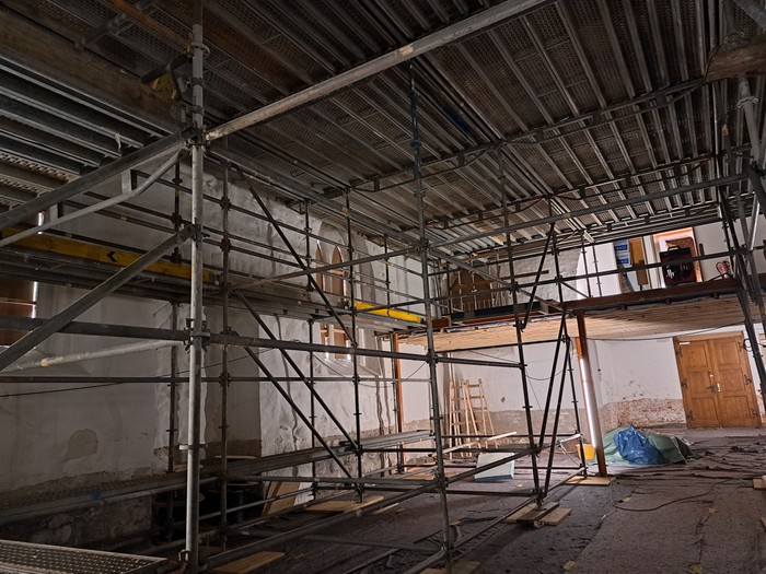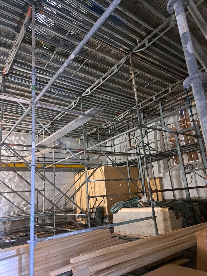 04.03.2025: Die Kirche ist nun bis Mitte April komplett eingerüstet. Hier finden zurzeit die Maler- und Trockenbauarbeiten im Deckenbereich statt.
